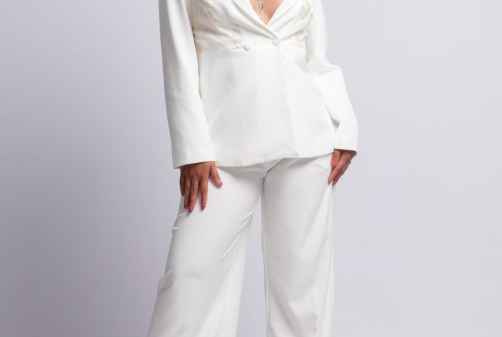 Pants: Wide-leg trousers that create a graceful silhouette, designed to offer both comfort and sophistication. Perfectly tailored, they complement the jacket seamlessly for a polished look.